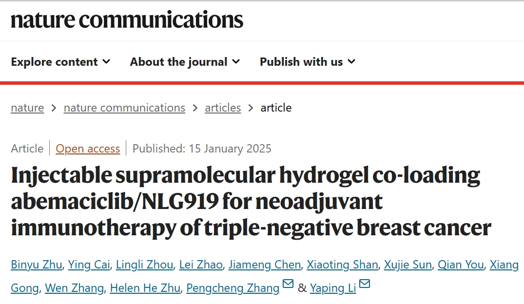 2025年1月15日,中国科学院上海药物研究所李亚平团队在期刊《Nature Communications》上发表了题为“Injectable supramolecular hydrogel co-loading abemaciclib/NLG919 for neoadjuvant immunotherapy of triple-negative breast cancer”的研究论文。研究结果表明, 新辅助免疫疗法可减少肿瘤复发和肺转移,延长动物生存期。这种水凝胶为三阴性乳腺癌的新辅助免疫疗法提供了一个潜在的平台,与游离阿贝西利单抗相比,它的毒性更低。