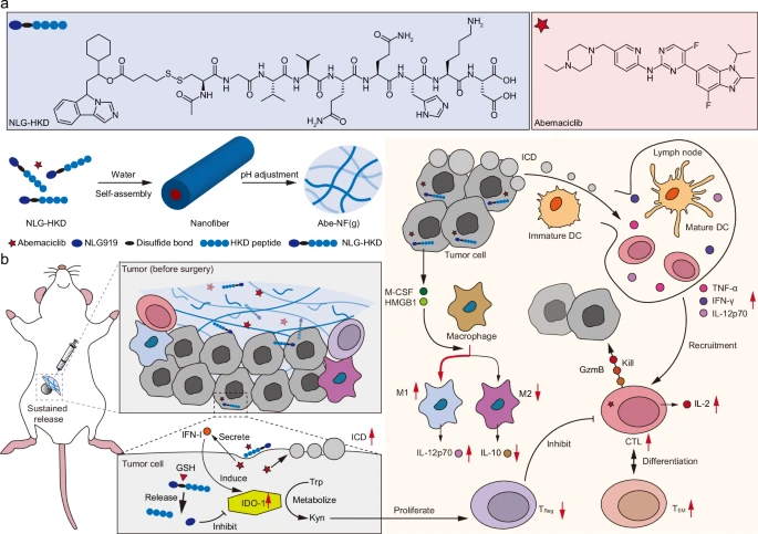 1. 现有全身化疗常诱发骨髓抑制和激活免疫抑制通路,而研究展示了一种药物储存策略,即注射用Abe负载肽-NLG919纳米纤维超分子水凝胶(Abe-NF(g)),可同时激发抗肿瘤免疫力和抑制治疗诱导的IDO-1。