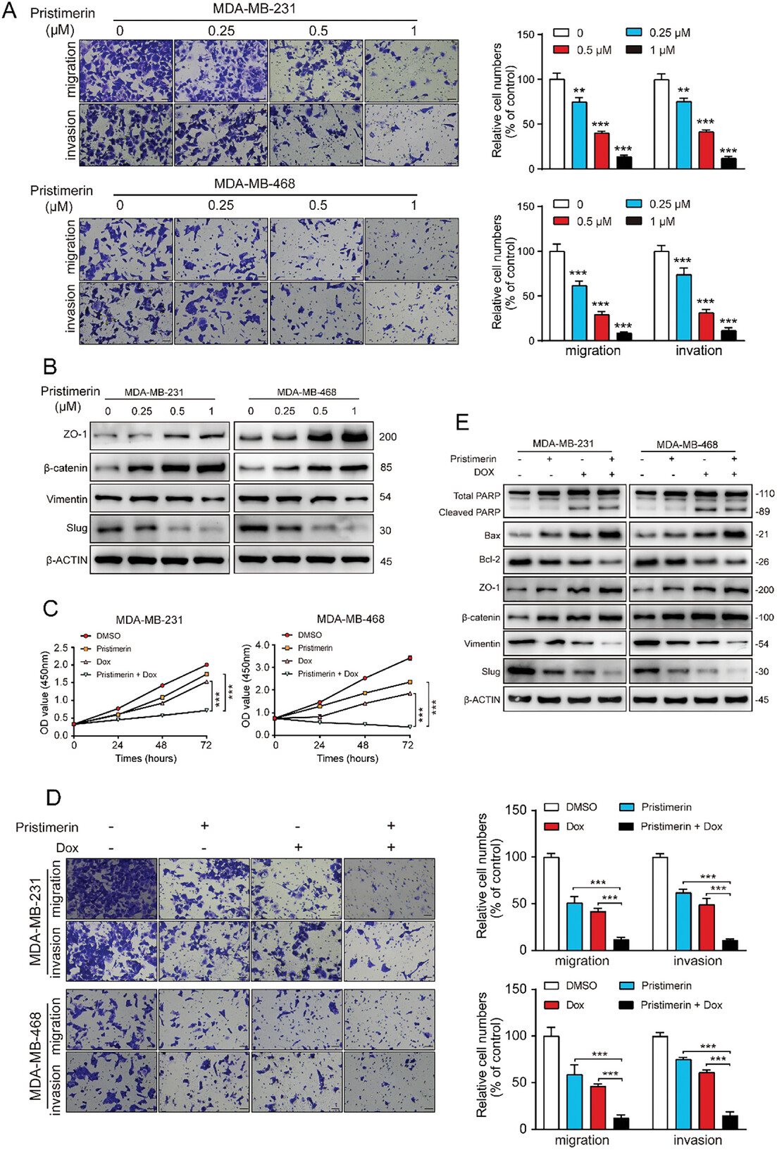 接下来,研究人员研究了扁蒴藤素对三阴性乳腺癌细胞迁移和侵袭的影响。迁移实验表明,扁蒴藤素显著抑制了三阴性乳腺癌细胞的迁移和侵袭。这一观察结果还得到了上皮细胞标志物以及间充质细胞标志物的进一步支持。此外,研究人员还探讨了扁蒴藤素克服化疗耐药性的潜力。研究人员评估了在有或无扁蒴藤素的情况下,三阴性乳腺癌细胞对一线化疗药物阿霉素的敏感性。CCK-8 和 迁移实验结果表明,低剂量阿霉素与低剂量扁蒴藤素联合使用,与单独使用任何一种药物相比,显著抑制了三阴性乳腺癌细胞的增殖、迁移和侵袭。这些发现共同表明,扁蒴藤素能够增强三阴性乳腺癌细胞对阿霉素的治疗敏感性。总之,本研究结果表明,扁蒴藤素有可能提高阿霉素在三阴性乳腺癌细胞中的治疗效果。