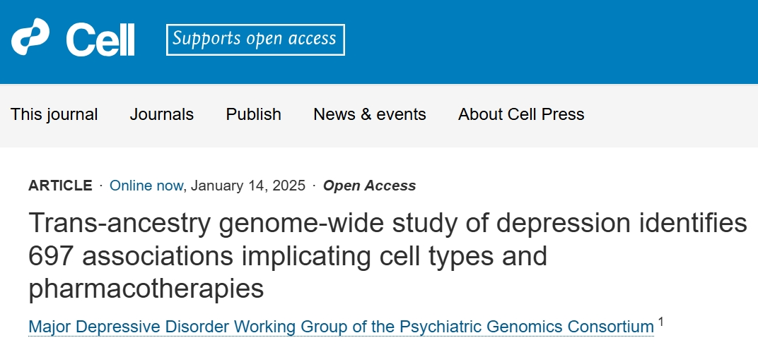 2025年1月14日,精神病基因组学联盟 (Psychiatric Genomics Consortium) 的重度抑郁症工作组在期刊《Cell》上合作发表了题为“Trans-ancestry genome-wide study of depression identifies 697 associations implicating cell types and pharmacotherapies”的研究论文。团队发现了308个高置信度基因关联以及突触后密度和受体集群的富集。在小鼠和人类的单细胞分析中,兴奋性神经元、抑制性神经元和中棘神经元都与杏仁核神经元有关。这些关联富含抗抑郁靶点,提供了潜在的再利用机会。利用欧洲人或多血统数据训练的多基因评分,团队可预测所有血统的多发性抑郁症状态,最高可解释欧洲人多发性抑郁症变异的5.8%。