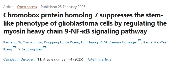 2月23日,南京医科大学/香港大学/悉尼大学研究人员合作共同在期刊《Cell Death Discovery》上发表了研究论文,题为“Chromobox protein homolog 7 suppresses the stem-like phenotype of glioblastoma cells by regulating the myosin heavy chain 9-NF-κB signaling pathway”,本研究表明,CBX7 在抑制胶质母细胞瘤的干细胞样表型方面发挥着关键作用。在本研究中,通过生物信息学分析,研究人员发现 CBX7 是胶质母细胞瘤中 CBX 家族下调最显著的成员,并且与胶质母细胞瘤细胞的干细胞样表型密切相关。此外,研究人员证明在胶质母细胞瘤细胞中过表达 MYH9 可逆转 CBX7 对胶质母细胞瘤细胞迁移、增殖、侵袭和干性的抑制作用。总之,CBX7 通过抑制胶质母细胞瘤的干细胞样特性发挥肿瘤抑制作用。CBX7-MYH9-NF-κB 信号轴可能成为胶质母细胞瘤的潜在治疗靶点。