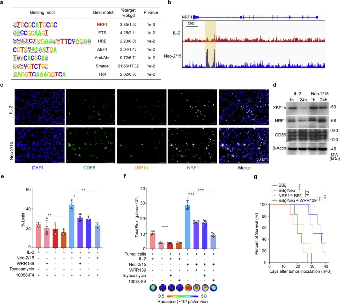 4. NRF1和c-Myc的调控作用:NRF1是Neo-2/15处理的CAR-NK细胞中XBP1s介导的基因表达的主要转录靶标,能够增强细胞毒性。c-Myc和NRF1通过调控线粒体功能相关基因的表达,影响细胞代谢和抗肿瘤效果。抑制NRF1或c-Myc,会降低CAR-NK细胞的ATP生成和抗肿瘤疗效。
