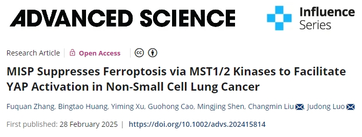 2月28日,同济大学/中国科学技术大学研究人员合作共同在期刊《Advanced Science》上发表了研究论文,题为“MISP Suppresses Ferroptosis via MST1/2 Kinases to Facilitate YAP Activation in Non-Small Cell Lung Cancer”,本研究中,研究人员发现MISP是抑制非小细胞肺癌(NSCLC)铁死亡的关键因子。MISP 在 NSCLC 组织中表达上调,其缺失会使细胞对铁死亡敏感,从而在体外和体内降低细胞增殖。研究人员还发现了一个破坏 MISP 与 MST1/2 结合的 MISP-R390/391A 突变体,进一步说明了 Hippo 信号传导的 MST1/2 依赖性抑制。尤其是,MISP 是 YAP 的靶点,形成了一个放大 YAP 信号传导的反馈回路。本研究结果表明,MISP-YAP 轴可调节铁死亡,这使 MISP 成为 NSCLC 的潜在治疗靶点,尤其是在 YAP 调控失调的情况下。