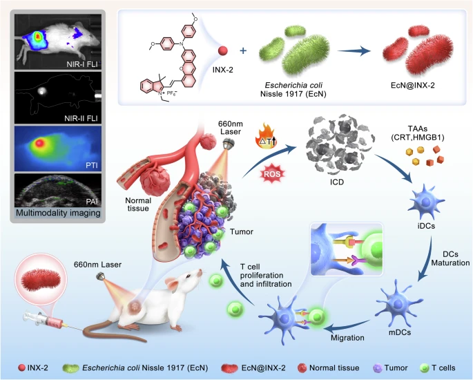 2. 细菌修饰的递送系统:INX-2与肿瘤靶向细菌EcN结合,形成生物纳米材料,能够通过NIR-II FLI-PAI-PTI多模态成像靶向肿瘤低氧区域,并通过光疗诱导肿瘤消融。
