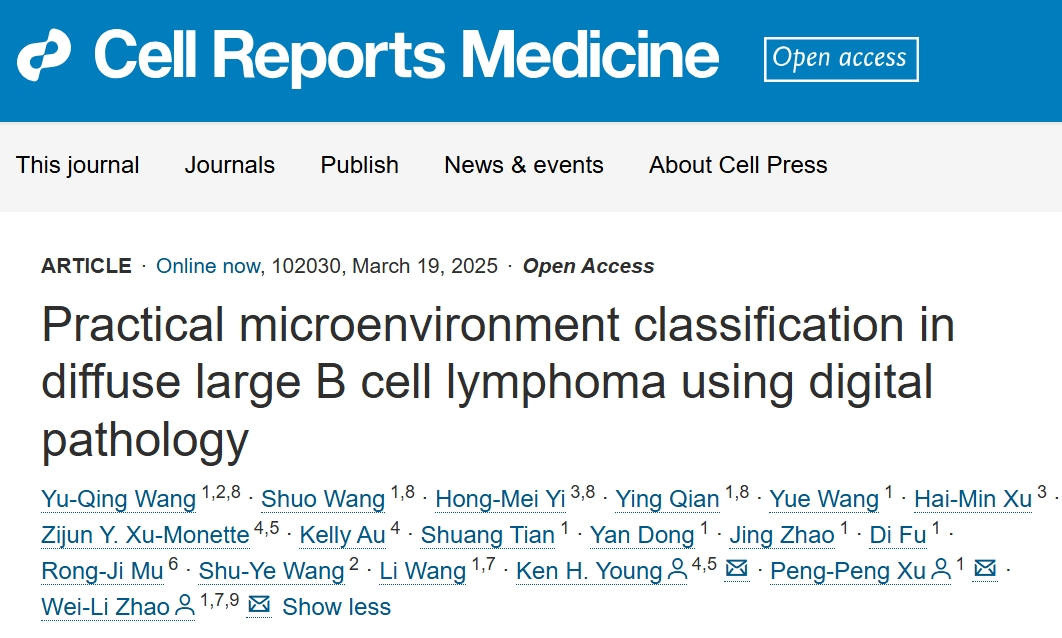 2025年3月19日,上海交通大学医学院附属瑞金医院/美国杜克大学的研究团队在期刊《Cell Reports Medicine》上发表了题为“Practical microenvironment classification in diffuse large B cell lymphoma using digital pathology”的研究论文。