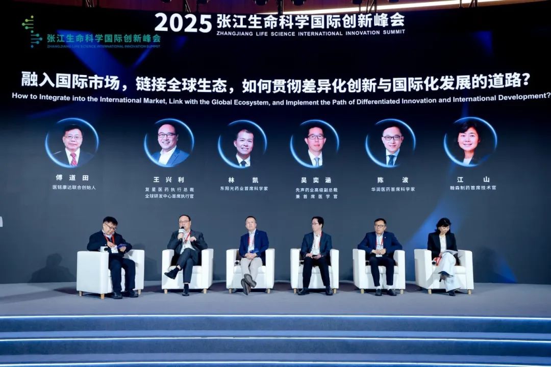 在全球化浪潮推动下,生物医药行业正以前所未有的速度融入国际市场,链接全球生态。对于生物医药企业而言,这既是一个充满机遇的时代,也是一个充满挑战的时代。在第二个“话题讨论:融入国际市场,链接全球生态,如何贯彻差异化创新与国际化发展的道路”环节,在医铭康达联合创始人傅道田的主持下,复星医药执行总裁、全球研发中心首席执行官王兴利,华润医药首席科学家陈波,翰森制药首席技术官江山,先声药业高级副总裁兼首席医学官吴奕涵,东阳光药业首席科学家林凯带来了精彩的观点分享,让与会观众看到了医药行业在差异化创新与国际化发展道路上的多种可能性和实践路径。