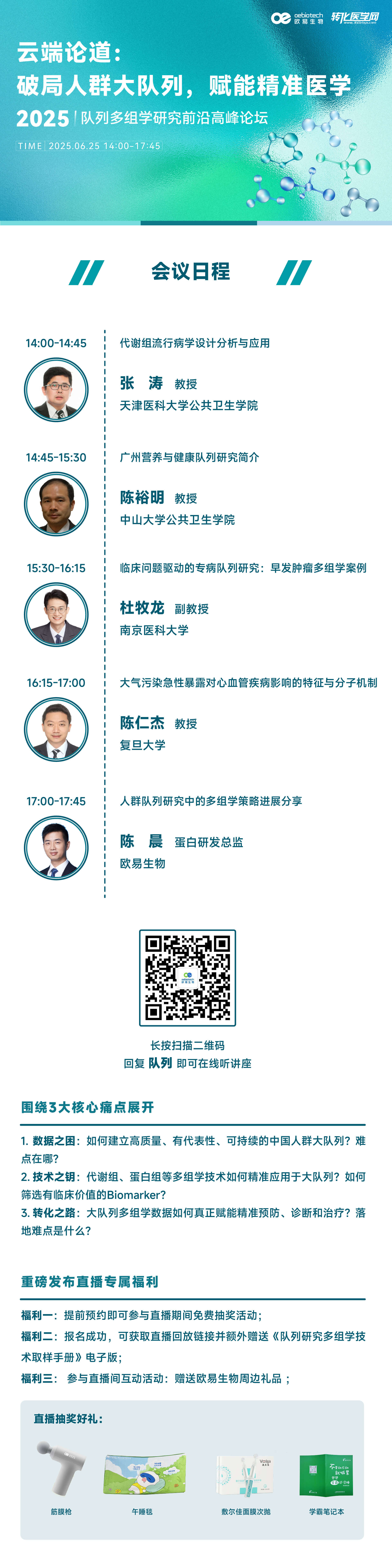 在生物医学研究领域,大型队列研究具有极为关键的地位。其借助对大规模人群的长期跟踪观测,广泛采集涉及多维度的数据,进而为深度剖析疾病的发生与发展机制,以及制定精准的疾病预防与治疗策略奠定基础。但是目前我国大型队列发展之路仍面临诸多挑战,比如数据的欠缺,代表性及多样化队列建立等,本次由欧易生物联合转化医学网于6月25日在线上举办的主题为《云端论道:破局人群大队列,赋能精准医学——2025队列多组学研究前沿高峰论坛》,特邀长期从事生命历程纵向队列研究,聚焦重大慢性病全生命周期精准防控、多组学标志物研究优青专家及从事人群队列生物标志物及疾病防治研究和主持多项代谢性疾病相关项目优秀学者莅临本次会议分享,特邀您的参与!