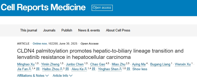 6月30日,复旦大学/暨南大学研究人员合作共同在期刊《Cell Reports Medicine》上发表了研究论文,题为“CLDN4 palmitoylation promotes hepatic-to-biliary lineage transition and lenvatinib resistance in hepatocellular carcinoma”,本研究中,研究人员确定了与CLDN4相关的肝细胞向胆管细胞的谱系转变(HBT)是减轻肝细胞癌(HCC)对仑伐替尼耐药性的潜在靶点。CLDN4 的表达在仑伐替尼耐药患者中更为普遍。锚定的 CLDN4 促进了 HCC 细胞的表型转变,增加了对仑伐替尼的耐药性。一种 CLDN4 的抑制剂,被证明可降低 HCC 中的 HBT 和仑伐替尼耐药性。此外,联合化疗似乎是 HCC 患者发生 HBT 时的一种有效治疗策略。