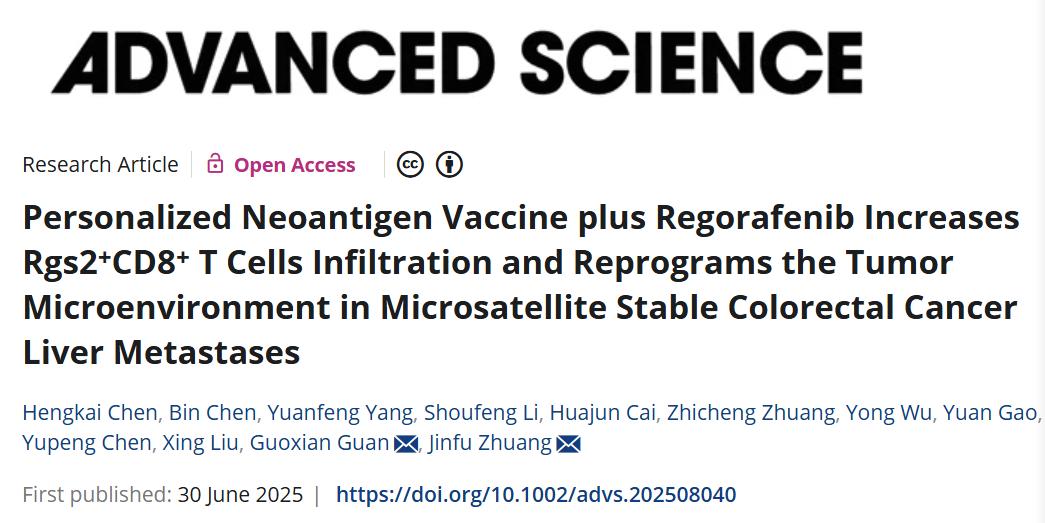 6月30日,福建医科大学研究团队在期刊《Advanced Science》上发表了研究论文,题为“Personalized Neoantigen Vaccine plus Regorafenib Increases Rgs2⁺CD8⁺ T Cells Infiltration and Reprograms the Tumor Microenvironment in Microsatellite Stable Colorectal Cancer Liver Metastases”,本研究中,研究人员利用小鼠微卫星稳定型结直肠癌细胞的全外显子组和 RNA 测序,开发了一种个性化新抗原疫苗 Neo-CRCVAS,并将其与瑞戈非尼联合使用,作为新型疗法(RegoNeo)。在微卫星稳定型结直肠癌肝转移(MSS-CRLM)小鼠模型中,RegoNeo 显著增强了肿瘤消退和生存率,同时建立了持久的免疫记忆。这些发现表明,RegoNeo 是一种有前景的个性化免疫疗法,通过增加 Rgs2⁺CD8⁺ T 细胞浸润来重新编程免疫抑制性肿瘤微环境,凸显了这种治疗方法和这一特定 T 细胞亚群作为 MSS-CRLM 患者的潜在治疗靶点。