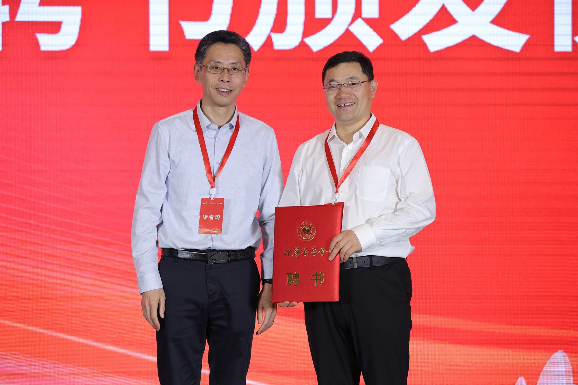 梁春琦书记向中国科学院院士、南京大学副校长、中国科学院深圳先进技术研究院研究员郑海荣院士颁发《中华药械研究与临床》第一届编辑委员会总编辑聘书。