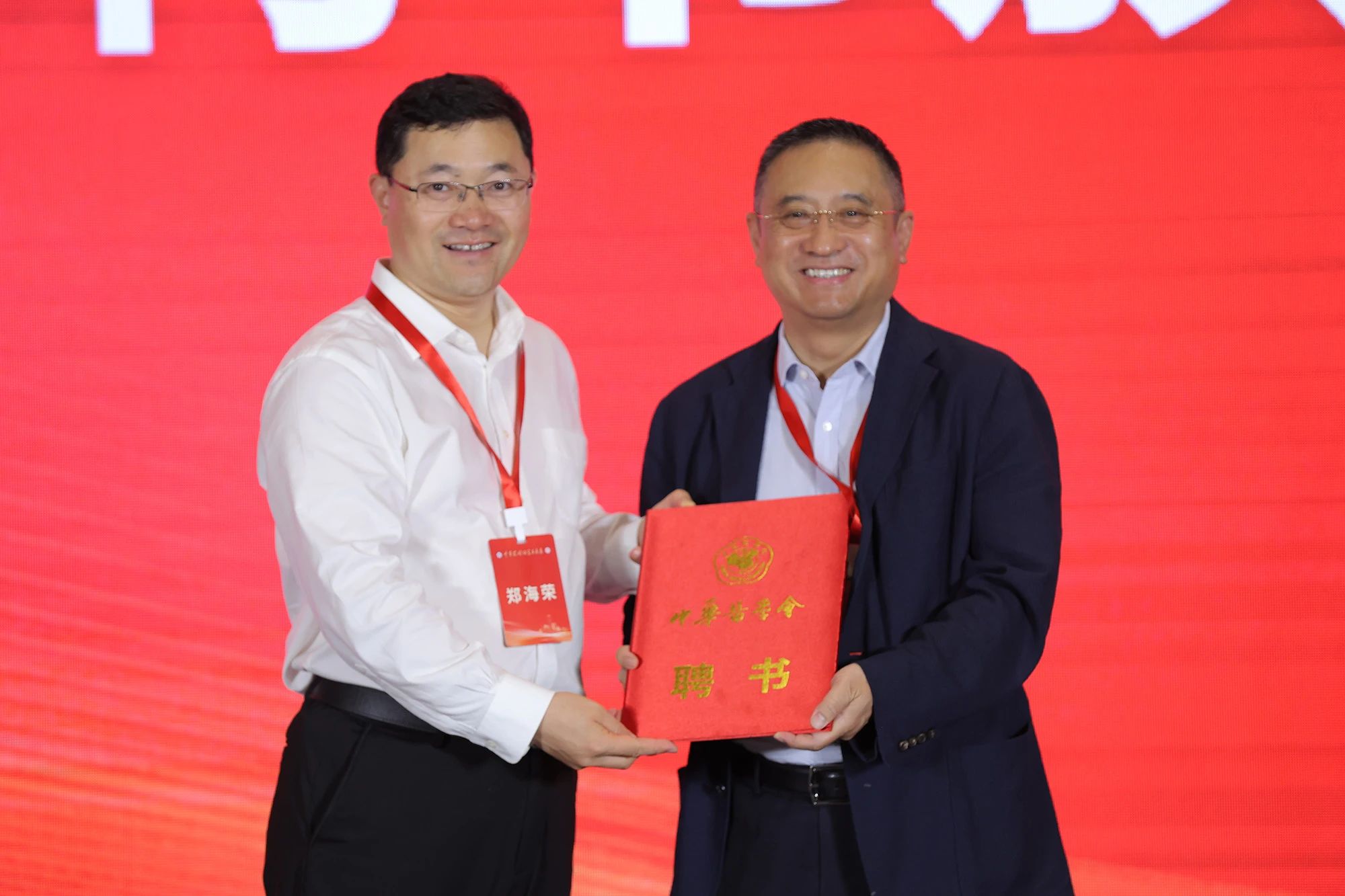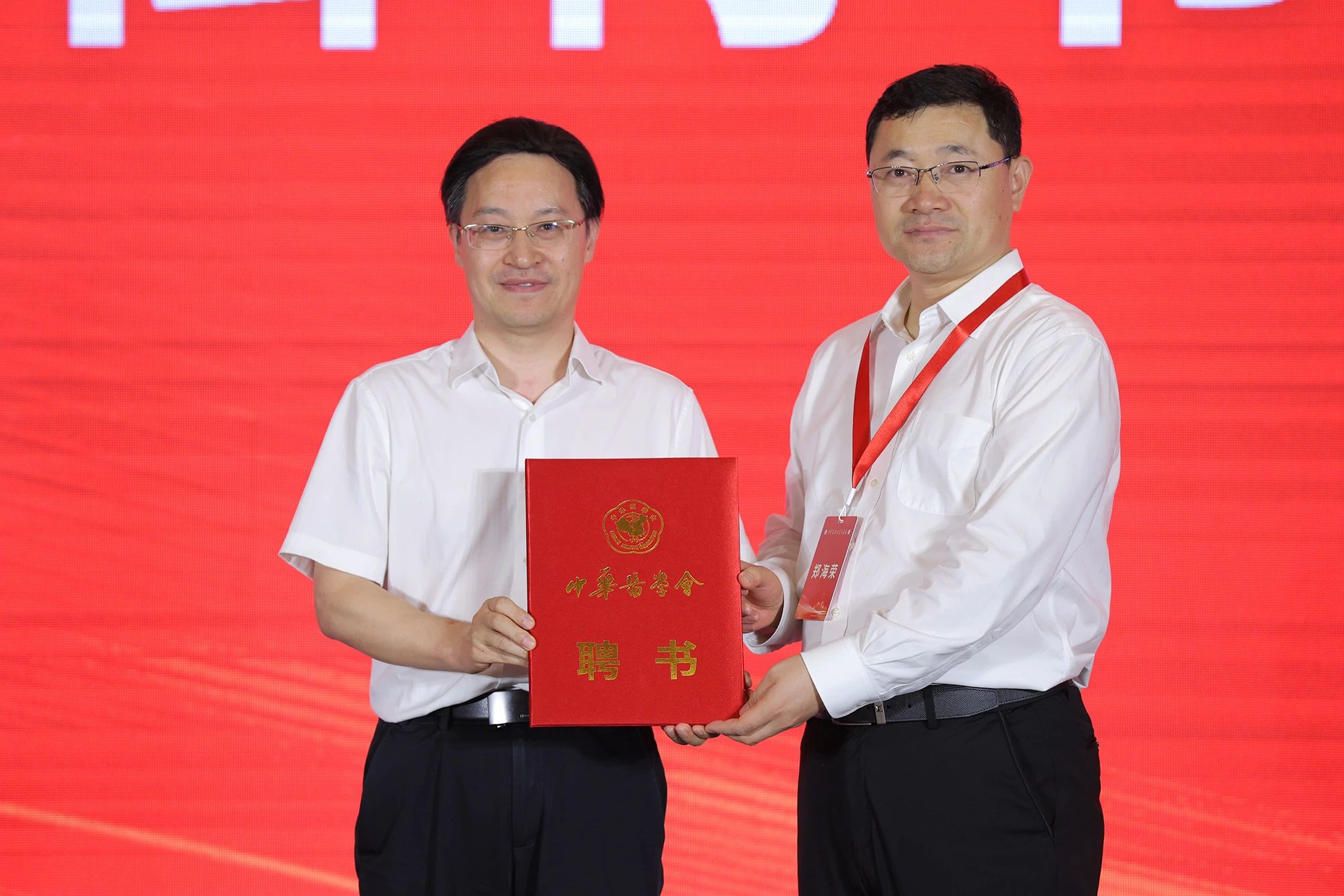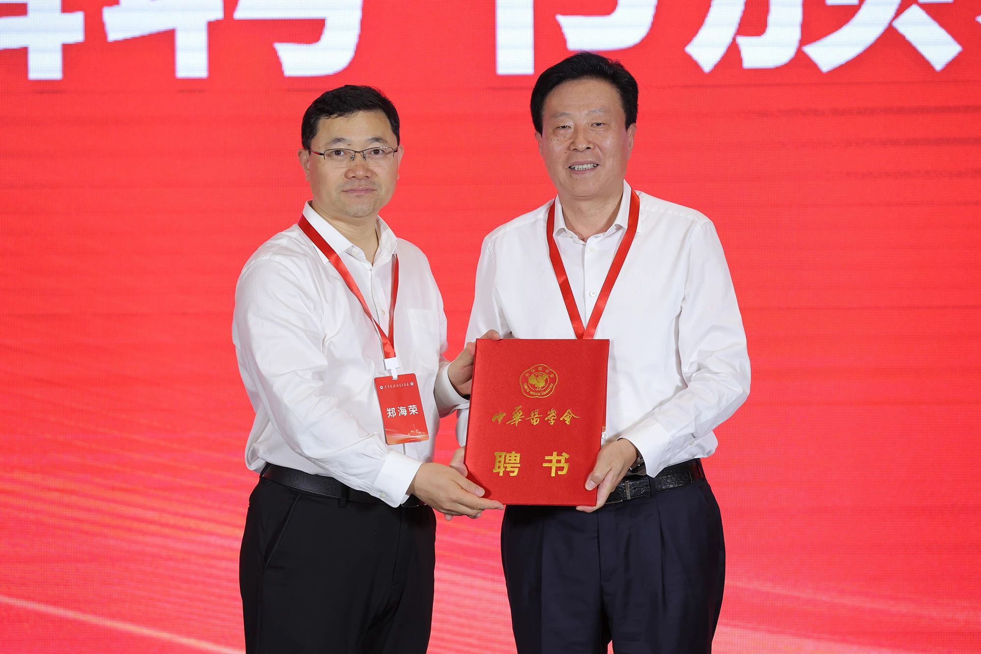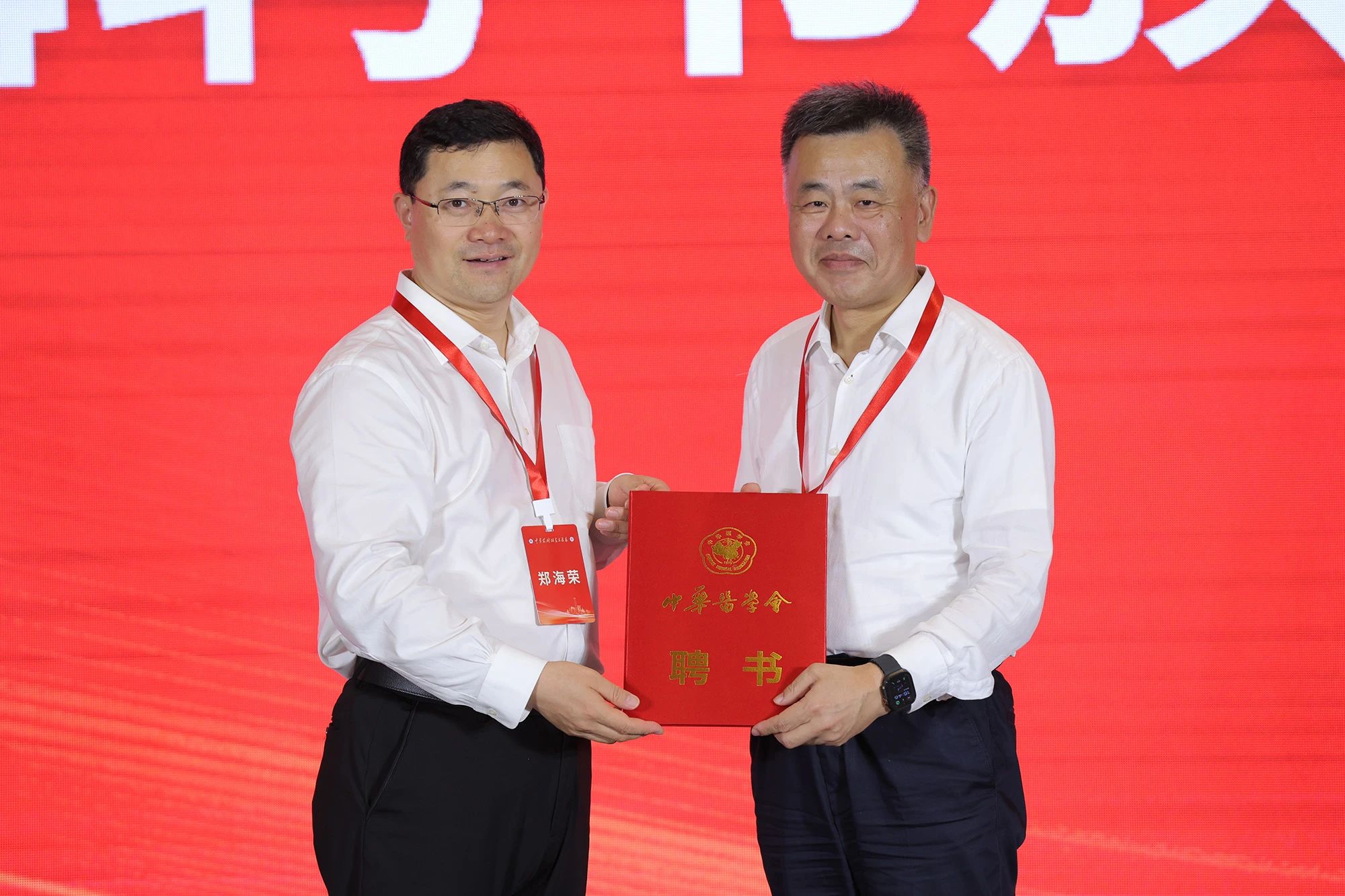 郑海荣院士向复旦大学附属中山医院院长周俭教授颁发《中华药械研究与临床》第一届编辑委员会副总编辑聘书。