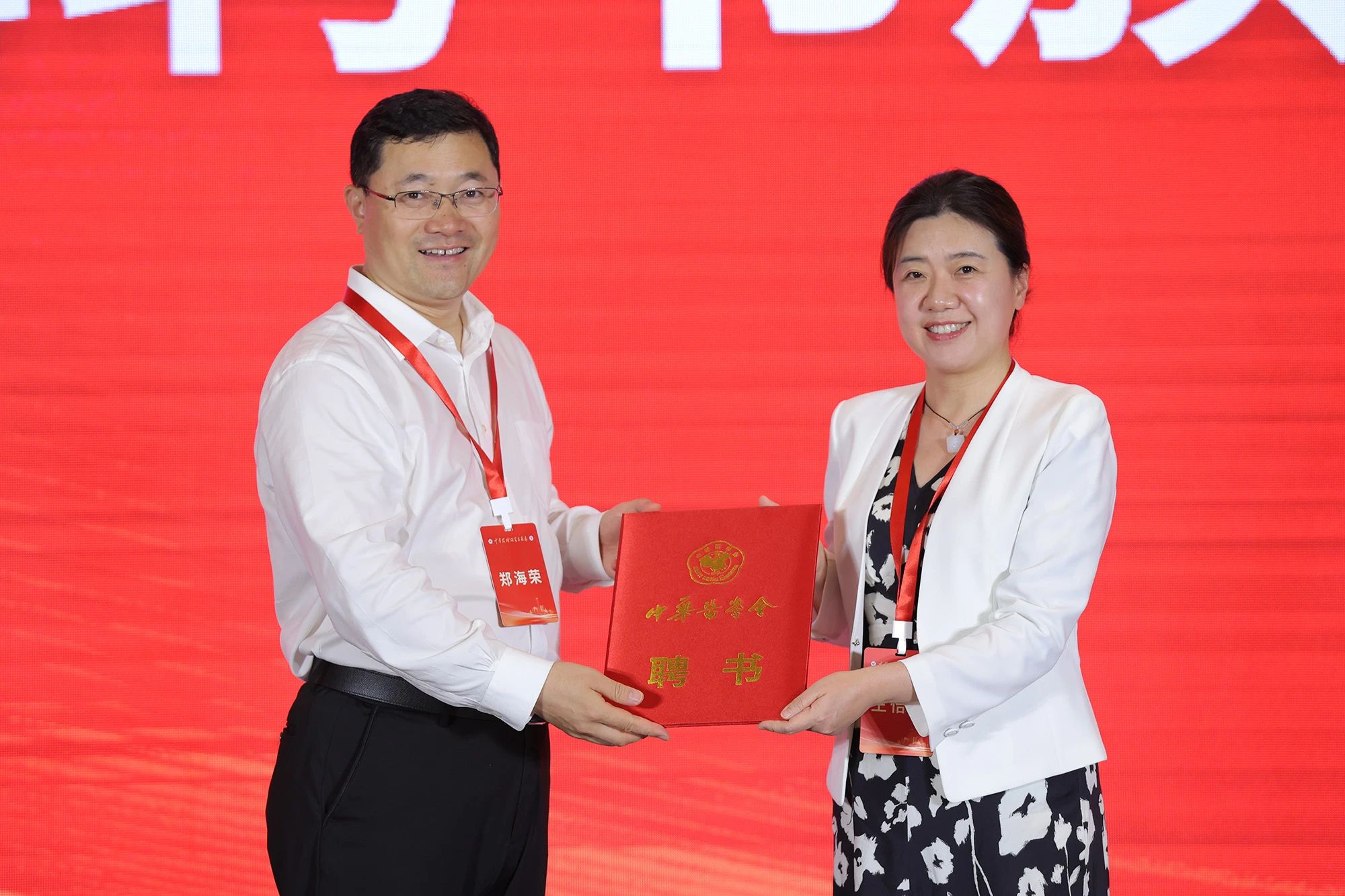 郑海荣院士向北京协和医院放射科副主任王怡宁教授颁发《中华药械研究与临床》第一届编辑委员会副总编辑聘书。