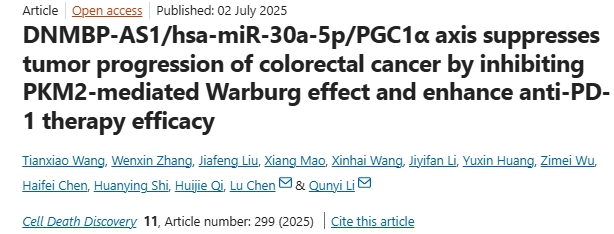 7月2日,复旦大学研究团队在期刊《Cell Death Discovery》上发表了研究论文,题为“DNMBP-AS1/hsa-miR-30a-5p/PGC1α axis suppresses tumor progression of colorectal cancer by inhibiting PKM2-mediated Warburg effect and enhance anti-PD-1 therapy efficacy”,本研究中,研究人员利用生物信息学分析和双荧光素酶报告基因实验,鉴定出了 DNMBP-AS1/hsa-miR-30a-5p/PGC1α ceRNA 网络。此外,研究人员还研究了 PGC1α 表达变化对结直肠癌(CRC)增殖和代谢重编程的影响。另外,研究人员还探讨了 PGC1α 对PKM2以及结直肠癌恶性行为表现的影响。本研究结果为 DNMBP-AS1/hsa-miR-30a-5p/PGC1α 网络在控制结直肠癌增殖、代谢和免疫反应中的作用提供了新的视角。本研究还表明,使用罗格列酮联合 PGC1α 激动剂治疗结直肠癌是一种很有前景的治疗方法。