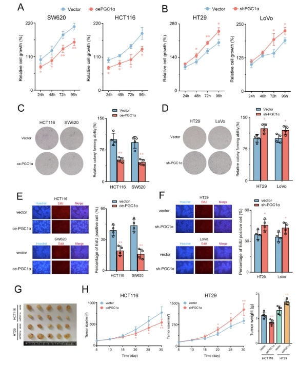 为了探究 PGC1α 在结直肠癌(CRC)中的生物学功能,研究人员首先分析了其在多种 CRC 细胞系中的 mRNA 和蛋白质表达水平。随后,基于 PGC1α 的表达水平,研究人员在 HT29 和 LoVo 细胞中构建了 PGC1α 敲低的稳定模型,在 HCT116 和 SW620 细胞中构建了 PGC1α 过表达的稳定模型。通过 qRT-PCR 和 蛋白质免疫印迹实验对这些模型的有效性进行了评估。值得注意的是,研究结果表明,与对照细胞相比,PGC1α 过表达抑制了 CRC 细胞的活力、集落形成和 DNA 合成,而 PGC1α 沉默则促进了 CRC 细胞的增殖。为了进一步评估 PGC1α 在体内的肿瘤抑制作用,研究人员将稳定细胞系皮下移植到裸鼠体内,并监测肿瘤生长情况。结果表明,与对照组相比,PGC1α 过表达显著抑制了裸鼠体内肿瘤的生长,这与体外研究结果一致。相反,抑制 PGC1α 则显著增加了异种移植瘤的生长。此外,过表达 PGC1α 的 CRC 细胞的肿瘤体积和重量均显著降低。相比之下,与对照组相比,PGC1α 敲低显著增加了肿瘤体积和重量。体内和体外实验结果表明,PGC1α 通过抑制癌细胞增殖在结直肠癌中发挥着肿瘤抑制因子的作用。