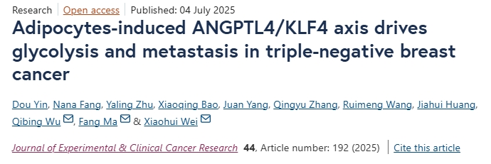 7月4日,安徽医科大学研究团队在期刊《Journal of Experimental & Clinical Cancer Research》上发表了研究论文,题为“Adipocytes-induced ANGPTL4/KLF4 axis drives glycolysis and metastasis in triple-negative breast cancer”,本研究中,研究结果表明,ANGPTL4在富含脂肪细胞的肿瘤环境中表达水平显著高于缺乏脂肪细胞的共生环境。此外,肿瘤细胞中 ANGPTL4 的表达对于脂肪细胞驱动的糖酵解和转移至关重要。在癌症相关脂肪细胞中富集的白细胞介素 6(IL-6)以及脂肪细胞释放的脂解产生的游离脂肪酸(FFAs),通过激活三阴性乳腺癌(TNBC)细胞中的 STAT3 和 PPARα 通路,增强 ANGPTL4 介导的糖酵解和转移。此外,ANGPTL4 与转录因子 KLF4 相互作用并增强其活性,进一步促进糖酵解和转移,而 KLF4 敲低则会减弱 TNBC 细胞的迁移和糖酵解。尤其是,在转移性乳腺癌标本中观察到 ANGPTL4 和 KLF4 的表达水平高于非转移性病例,并且与不良预后呈正相关。总之,本研究结果揭示了脂肪细胞与三阴性乳腺癌细胞之间复杂的代谢相互作用,这种相互作用促进了肿瘤的侵袭性。ANGPTL4在此过程中成为关键的介导因子,使其成为抑制三阴性乳腺癌进展的有前景的治疗靶点。