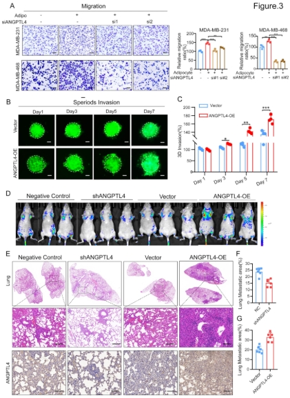 为揭示 ANGPTL4 敲低对脂肪细胞驱动的三阴性乳腺癌(TNBC)迁移的影响,研究人员进行了迁移实验,结果表明通过 siRNA 沉默 ANGPTL4 显著抑制了脂肪细胞诱导的 TNBC 细胞迁移。相反,在 TNBC 细胞中异位表达 ANGPTL4 明显增加了 TNBC 细胞的迁移。为探究 ANGPTL4 对 TNBC 侵袭的影响,研究人员将过表达 ANGPTL4 的绿色荧光蛋白(GFP)标记的 TNBC 细胞球体接种在基质胶表面,结果显示在第 3 天、第 5 天和第 7 天,异位表达 ANGPTL4 均导致 TNBC 在基质胶中的侵袭增加,且 ANGPTL4 的促侵袭作用随着侵袭时间的延长而愈发显著。