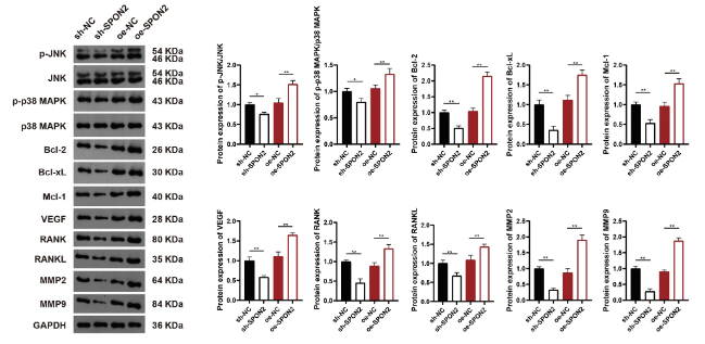 接下来,为了探究 SPON2 影响骨肉瘤细胞迁移的机制,研究人员进一步研究了 SPON2 在骨肉瘤中调控的信号通路。值得注意的是,蛋白质印迹法表明,与 sh-NC 组相比,SPON2 敲低显著抑制了 p-JNK、p-p38 MAPK、Bcl-2、Bcl-xL、Mcl-1、VEGF、RANK、RANKL、MMP2 和 MMP9 的表达水平。相反,与 oe-NC 组相比,SPON2 过表达显著提高了这些蛋白的水平。综上所述,这些发现表明 SPON2 可能通过激活 p38 MAPK 通路、抗凋亡信号、血管生成通路、RANK/RANKL 信号以及细胞外基质降解通路来促进肿瘤侵袭和转移。
