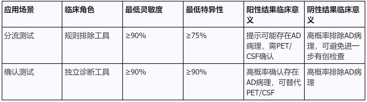确诊赛道:灵敏度≥90%,特异性 ≥90% 的测试,可作为金标准PET或脑脊液检测的替代方案。