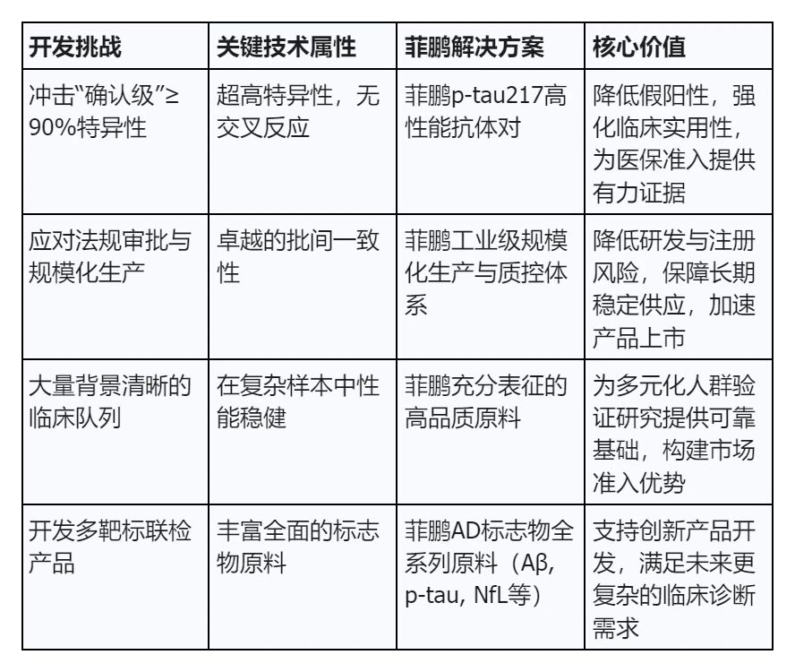 指南的背后,是对p-tau217等核心生物标志物的认可。菲鹏的AD解决方案,正是围绕p-tau217及其比值等关键指标进行深度开发。菲鹏通过科学的抗原抗体设计、严苛的筛选与验证流程,打造出具有卓越灵敏度与特异性的核心原料,为您的产品达到“双90”奠定最坚实的基石。