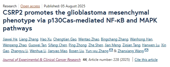8月5日,厦门大学研究团队在期刊《Journal of Experimental & Clinical Cancer Research》上发表了研究论文,题为“CSRP2 promotes the glioblastoma mesenchymal phenotype via p130Cas-mediated NF-κB and MAPK pathways”,本研究中,研究人员发现 CSRP2 在胶质母细胞瘤(GBM)中的表达显著增加,尤其是在间质型 GBM 中,并且高表达 CSRP2 的胶质瘤患者可能预后不良。在体外实验中,GBM 细胞中 CSRP2 过表达可促进细胞增殖、集落形成、迁移、侵袭、替莫唑胺耐药性以及肿瘤干细胞特性(PMT),在体内实验中可促进肿瘤形成。而敲低 CSRP2 则会产生相反的效果。最后,研究人员发现 MTO 与 CSRP2 结合,并抑制了 CSRP2 过表达对 GBM 细胞的恶性影响。总之,本研究结果表明,CSRP2 通过激活 p130Cas 介导的 NF-κB 和 MAPK 信号通路促进胶质母细胞瘤(GBM)的恶性发展,包括肿瘤的侵袭性生长和对替莫唑胺的耐药性。抑制 CSRP2 的功能,可能成为治疗胶质母细胞瘤的一种新方法。