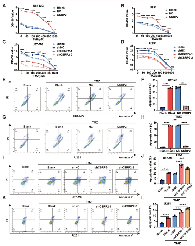 替莫唑胺(TMZ)耐药性是胶质母细胞瘤(GBM)高死亡率的重要因素之一,而其背后的分子机制尚未完全阐明。为了探究 CSRP2 是否与 GBM 中的替莫唑胺耐药性有关,研究人员用不同浓度的替莫唑胺处理过表达 CSRP2 或敲低 CSRP2 的细胞。替莫唑胺处理剂量依赖性地降低了所有细胞组的增殖。然而,与对照组相比,过表达 CSRP2 的细胞对替莫唑胺处理的增殖抑制更具耐药性,而敲低 CSRP2 的细胞对替莫唑胺处理的增殖抑制则更敏感。此外,与对照细胞相比,过表达 CSRP2 的细胞在替莫唑胺处理后表现出更少的细胞凋亡,而敲低 CSRP2 的细胞在替莫唑胺处理后表现出更多的细胞凋亡。