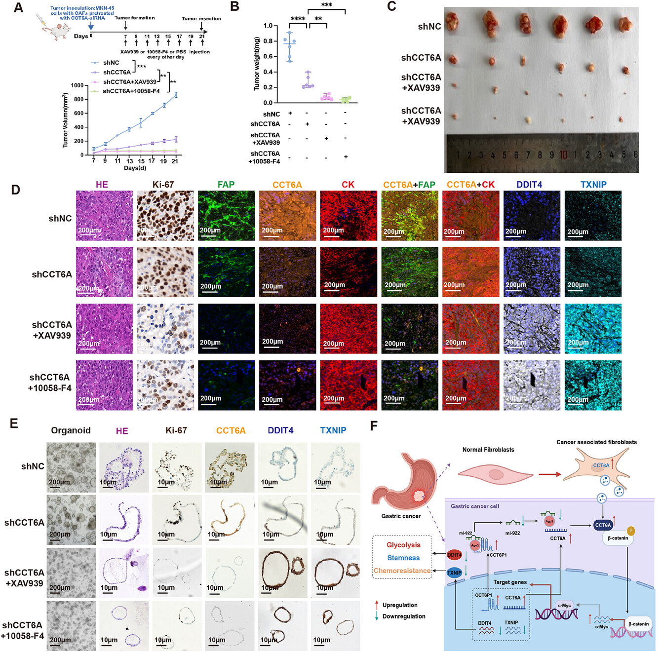 为了进一步评估在 CCT6A 敲低的癌相关成纤维细胞(CAFs)中靶向 Wnt/β-连环蛋白/c-Myc 信号通路的治疗潜力,研究人员将小鼠移植了对照组或 CCT6A 敲低的 MKN-45 细胞。从胃癌组织建立的患者来源类器官(PDO)模型证实,CCT6A 敲低抑制了 PDO 的形成。对移植瘤和 PDO 组织进行免疫组化分析进一步支持了 CAF 衍生的外泌体 CCT6A 在肿瘤进展中的作用,表现为 Ki-67 表达降低以及通过β-连环蛋白/c-Myc 轴调节的 DDIT4 和 TXNIP 表达增加。这些发现凸显了靶向 CCT6A/β-连环蛋白/c-Myc 轴的关键成分在调节胃癌生物学中的关键作用,并为胃癌治疗提供了潜在的治疗见解。