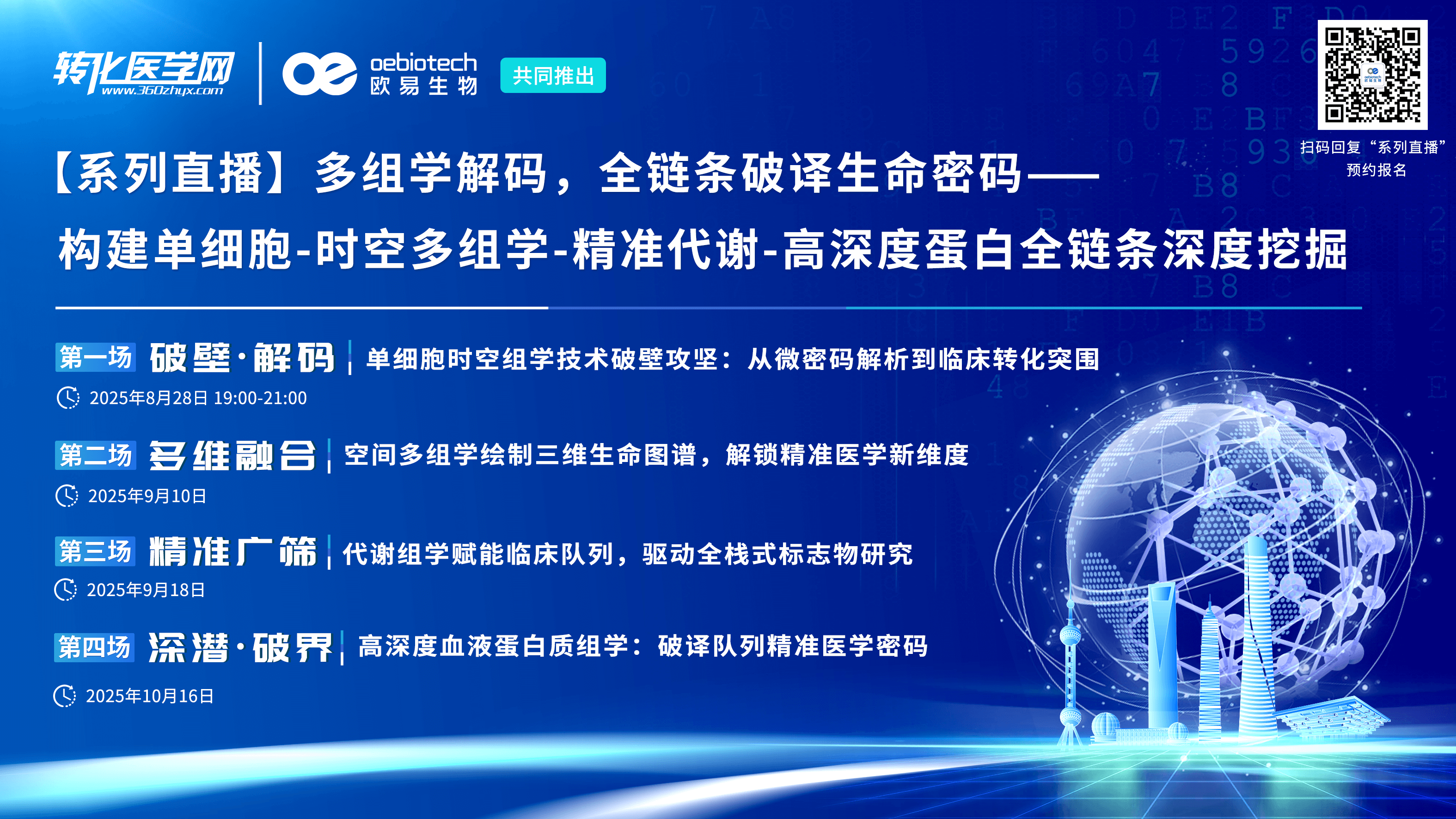 组学技术日新月异,正深刻变革生命认知与疾病研究。生命奥秘,组学解码!转化医学网联合欧易生物重磅推出 “多组学解码,全链条破译生命密码——贯穿单细胞-时空多组学-精准代谢-高深度蛋白全链条深度挖掘”系列直播。本系列围绕技术本质、科研思路、临床转化与数据分析四大核心维度,特邀领域专家带来四场层层递进的深度解析,助您系统掌握时空组学、空间多组学、精准代谢组学、高深度蛋白质组学前沿技术,打通从理论到实践的全链条认知,真正“吃透”组学研究的核心逻辑与应用价值,破译生命密码!