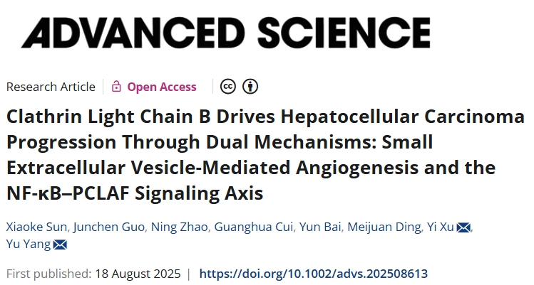 8月18日,哈尔滨医科大学研究团队在期刊《Advanced Science》上发表了研究论文,题为“Clathrin Light Chain B Drives Hepatocellular Carcinoma Progression Through Dual Mechanisms: Small Extracellular Vesicle-Mediated Angiogenesis and the NF-κB–PCLAF Signaling Axis”,本研究中,临床和生物信息学分析显示,CLTB 在肝细胞癌(HCC)组织中显著过表达。CLTB 基因沉默可抑制 HCC 细胞增殖、迁移和侵袭,而其过表达则会加剧恶性表型。本研究进一步探究了富含 CLTB 的 sEV 在肿瘤血管重塑中的功能意义。sEV-CLTB 通过与 SH3KBP1结合,抑制 SH3KBP1 泛素化降解,从而促进内皮细胞血管生成、破坏血管完整性并诱导肺血管渗漏。本研究证明,CLTB 通过 NF-κB-PCLAF 信号轴和小细胞外囊泡介导的血管重塑促进肝细胞癌进展,为开发靶向CLTB 的联合疗法提供了机制基础。