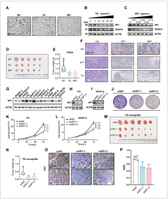 为了探究 SP1 在胰腺导管腺癌(PDAC)中的功能作用,研究人员在源自患者的 PDAC 类器官(PDO)模型中测试了 SP1 抑制剂的效果。在体外,用MIT或TA处理 PDO,这两种药物均已被报道可抑制 SP1 表达及其下游靶点 VEGFA。免疫印迹分析表明,MIT 和 TA 均能以剂量依赖的方式有效降低 SP1 和 VEGFA 蛋白水平。为了在体内进一步验证这些发现,研究人员将 PDO 正位移植到 NOD/ShiLtJGpt-Prkdcem26Cd52Il2rgem26Cd22/Gpt(NCG)小鼠的胰腺中,以建立 PDO 异种移植(PDOX)模型。用 TA或 MIT治疗携带肿瘤的 NCG 小鼠,显著抑制了体内 PDOX 肿瘤的生长。治疗后对 PDOX 肿瘤进行免疫组化染色,结果显示 SP1 和 Ki67 水平降低。