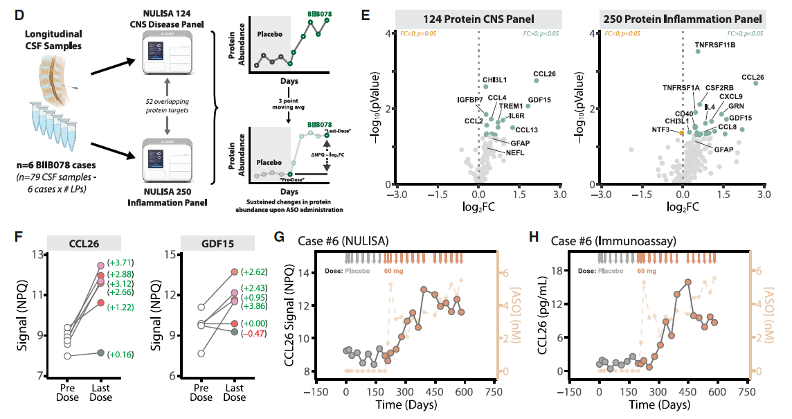 本研究清晰地揭示了既往药效学标志物(如 poly(GP))与大脑组织中的核心病理改变之间可能存在的巨大脱节。这表明,药物临床试验亟需更为准确、可靠、稳定的药效评估标志物。而筛选鉴定更可靠的新型标志物,需要兼具突破性灵敏度和超多重能力的蛋白组学技术。本研究正是采用了 NULISA 技术,借助其个位数 fg/mL 级的检测灵敏度、可以从uL级的临床样本中系统性定量检测数百种蛋白靶标的性能,首次在人类中枢神经系统中,系统地描绘了 ASO 药物可以引发的持续的、可被监测的免疫应答,并成功筛选得到了 BIIB078 的药效学生物标志物 CCL26。