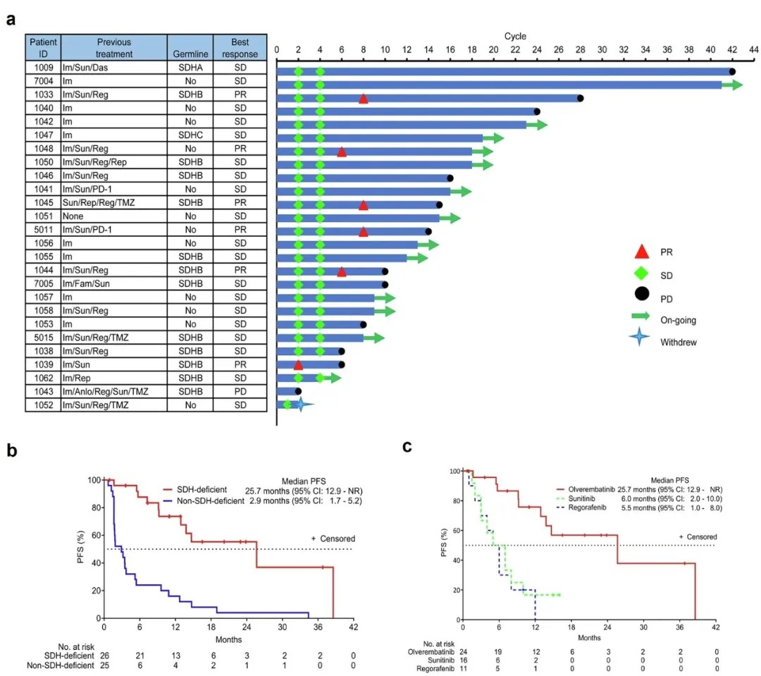 琥珀酸脱氢酶缺陷型胃肠道间质瘤占所有胃肠道间质瘤的5%-7.5%,好发于青少年和年轻人群,其对伊马替尼等标准靶向药物普遍耐药,既往治疗方案中位PFS仅6-10个月。本研究是迄今为止针对琥珀酸脱氢酶缺陷型胃肠道间质瘤规模最大的前瞻性临床试验。纳入26例TKI治疗失败的琥珀酸脱氢酶缺陷型胃肠道间质瘤患者,结果显示奥雷巴替尼治疗组客观缓解率(ORR)达23.1%,临床获益率(CBR)高达84.6%,且所有患者1年生存率为100%。更令人振奋的是,研究团队发现奥雷巴替尼对经多线治疗的患者依然有效,超过60%的入组患者曾接受至少两种TKI治疗,但其中位PFS仍达到25.7个月,这为晚期患者提供了新的生存希望。