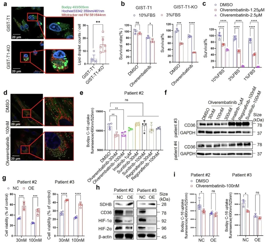 通过RNA测序和脂质组学分析,研究团队发现琥珀酸脱氢酶缺陷型胃肠道间质瘤存在显著的脂质代谢重编程。相较于非琥珀酸脱氢酶缺陷型肿瘤,其脂质摄取相关基因CD36、FABP4等表达显著上调,肿瘤细胞内脂滴积累增加。琥珀酸脱氢酶缺陷型肿瘤细胞就像脂质成瘾者,高度依赖外源性脂质维持生存,奥雷巴替尼能够特异性抑制脂质转运蛋白CD36的表达,切断肿瘤的能量供给线。研究通过体外实验证实,在低脂培养环境下,琥珀酸脱氢酶缺陷型肿瘤细胞对奥雷巴替尼的敏感性显著增强。