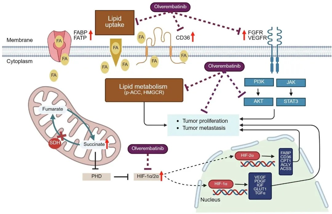 除脂质代谢调控外,研究还验证了奥雷巴替尼的多靶点抑制能力。该药物可同时抑制HIF-1α/2α、VEGFR、FGFR等关键信号通路,其中对FGFR1-4和VEGFR1-3的半数抑制浓度(IC50)均低于0.6 nM。在SDHB敲除的肿瘤细胞中,奥雷巴替尼处理组caspase-3切割增加,表明可有效诱导肿瘤细胞凋亡。