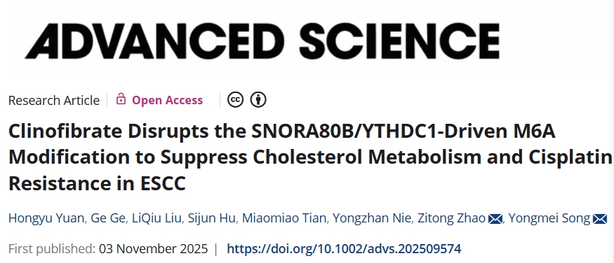 近日,中国医学科学院研究团队在期刊《Advanced Science》上发表了研究论文,题为“Clinofibrate Disrupts the SNORA80B/YTHDC1-Driven M6A Modification to Suppress Cholesterol Metabolism and Cisplatin Resistance in ESCC”,本研究探讨了受雄激素受体(AR)调控的小核仁 RNA(snoRNA)及其在食管鳞状细胞癌(ESCC)发病机制中的作用机制。通过高通量筛选 FDA 批准的药物,确定了克利贝特为 SNORA80B 抑制剂,它能破坏这一轴,并与顺铂协同作用,克服 ESCC 耐药性。该研究揭示了 SNORA80B 在 ESCC 中的非经典功能,确立了其作为 AR 驱动的代谢重编程的关键效应因子,通过 m⁶A 依赖性调节发挥作用。克利贝特的再利用展示了靶向snoRNA 介导通路的治疗潜力,为 ESCC 治疗提供了机制见解和临床可转化策略。这些发现重新界定了 snoRNA 在癌症发病机制中的功能范围。