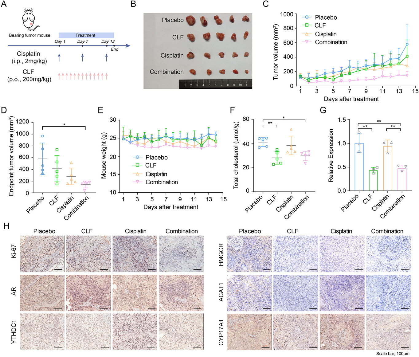 为了更好地实现临床转化并探究抑制 SNORA80B 以恢复食管鳞状细胞癌(ESCC)细胞对顺铂的敏感性,研究人员在体内实验中应用了可能抑制 SNORA80B 的克利贝特,并将其与顺铂联合使用。基于先前的结果,研究人员选择了 SNORA80B 表达高且雄激素受体(AR)水平适中的 KYSE450 细胞进行体内实验。将 KYSE450 细胞皮下植入 BALB/c 裸鼠体内,随机分为四组。体内实验结果表明,顺铂与克利贝特联合治疗组的小鼠肿瘤体积显著减小。此外,四组小鼠体重相当,表明联合治疗具有较高的安全性和较低的毒性。鉴于克利贝特是胆固醇合成的抑制剂,研究人员检测了小鼠肿瘤和血清中的胆固醇含量。结果表明,联合治疗组和单用克利贝特组的肿瘤胆固醇含量降低。此外,与安慰剂组相比,克利贝特治疗组和联合治疗组中 SNORA80B 的表达均显著下调。免疫组化分析显示,联合治疗组中增殖标志物(Ki-67)、雄激素受体(AR)以及胆固醇代谢蛋白(HMGCR、ACAT1 和 CYP17A1)的表达低于其他组。综上所述,这些数据表明克利贝特增强了顺铂在食管鳞状细胞癌异种移植模型中的敏感性。