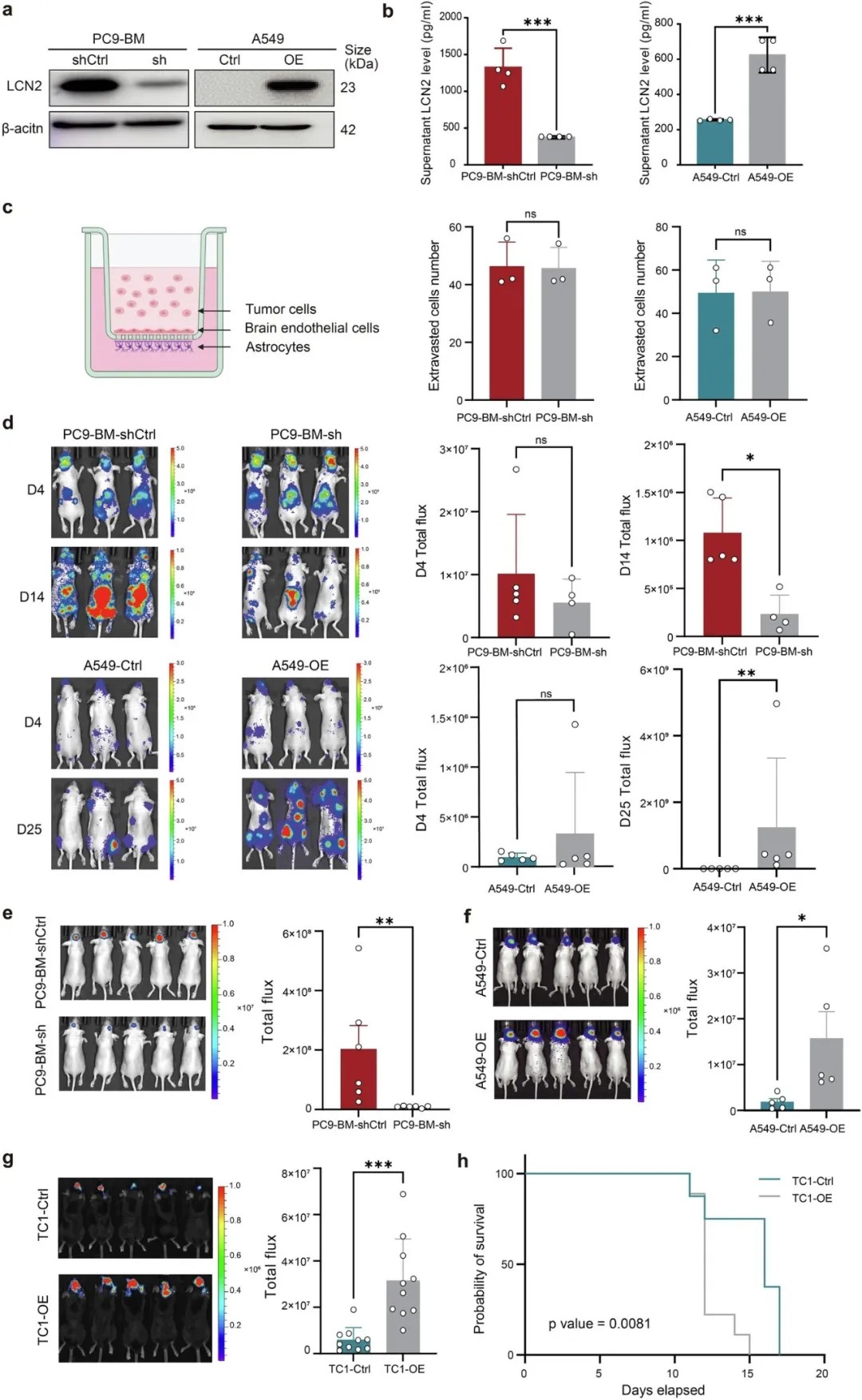 研究团队通过对比肺癌原发灶和脑转移灶的基因表达谱,发现LCN2在脑转移灶中显著上调。临床数据分析进一步证实,LCN2高表达的肺癌患者预后明显较差。