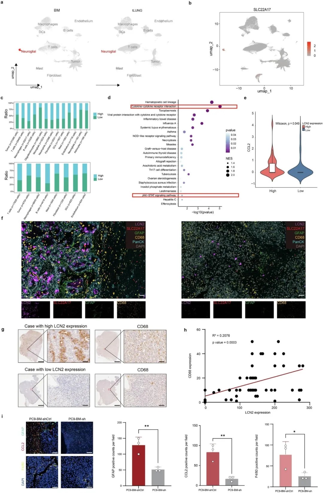 在机制上,肿瘤细胞分泌的LCN2与脑内的星形胶质细胞上的受体SLC22A17结合,激活JAK2/STAT3信号通路,诱导星形胶质细胞活化并分泌趋化因子,进而招募巨噬细胞聚集。
