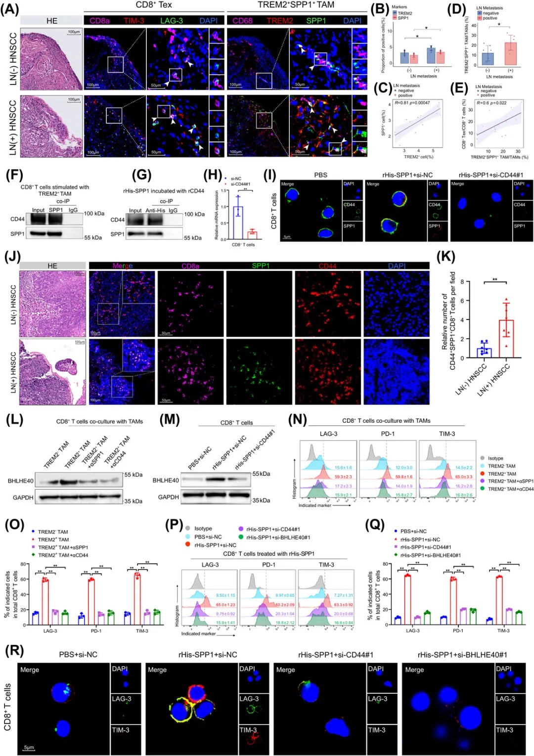 为了探究 TREM2+ 肿瘤相关巨噬细胞(TAMs)诱导 CD8+ 调节性 T 细胞(Tex)的机制,研究人员使用 CellChat 进行了细胞间通讯分析。总体而言,在所有 TAM 亚群中,TREM2+ TAMs 向 CD8+ Tex 发送的信号最强,这表明 TREM2+ TAMs 有可能通过细胞外信号刺激 CD8+ Tex。为了评估 TREM2+ 肿瘤相关巨噬细胞(TAMs)分泌的关键配体,研究人员首先对 TREM2+ TAMs 和 CD8+ 耗竭性 T 细胞(Tex)之间的主要信号通路进行了横向比较。通过比较相对强度和总体信号强度,三个配体-受体对脱颖而出,成为 TREM2+ TAMs 和 CD8+ Tex 之间串扰的主要介质。综合来看,这些结果表明 SPP1-CD44 轴可能介导 TREM2+ TAMs 促进 CD8+ T 细胞耗竭的作用。为确认 SPP1-CD44 轴介导了 TREM2+肿瘤相关巨噬细胞(TAMs)诱导的 CD8+T 细胞耗竭,研究人员首先使用多重免疫组化(mIHC)检测了头颈部鳞状细胞癌(HNSCC)肿瘤组织中 TREM2+TAMs 中 SPP1 的表达。随后,研究人员验证了 TREM2+TAMs 是否通过 SPP1-CD44 轴诱导 CD8+T 细胞耗竭。随后进行了体外实验,发现阻断 SPP1 或 CD44 显著削弱了 TREM2+ 肿瘤相关巨噬细胞(TAMs)上调 CD8+ T 细胞中 BHLHE40 表达和耗竭标志物的能力。此外,沉默 CD44 或 BHLHE40 减弱了 SPP1 直接促进 CD8+ T 细胞中耗竭标志物表达的作用。综上所述,这些发现表明,TREM2+ TAMs 通过 SPP1–CD44 轴激活 BHLHE40,从而促进 CD8+ T 细胞耗竭,有助于 HNSCC 的免疫逃逸和淋巴结转移。