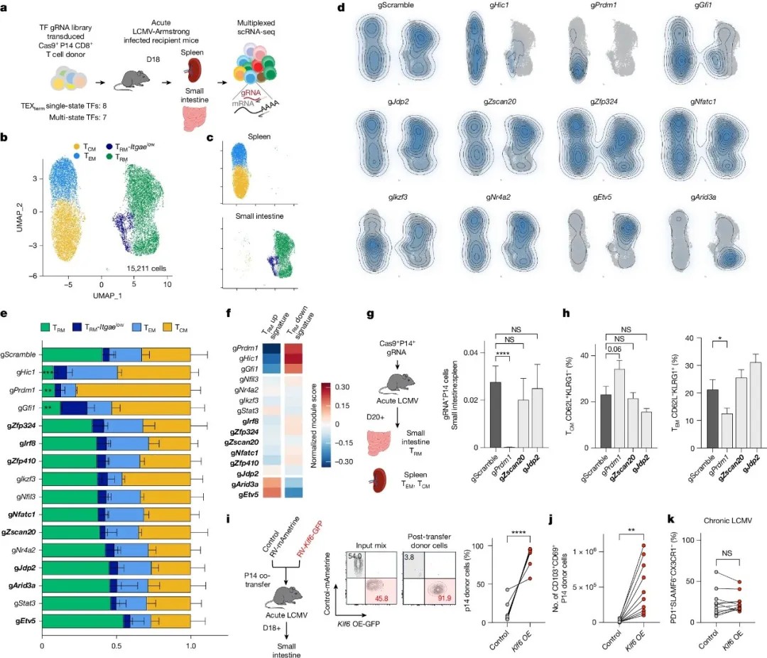 研究人员设计了一个包含19个转录因子的向导RNA文库,在慢性淋巴细胞性脉络丛脑膜炎病毒感染模型中进行了筛选。结果显示,敲除大多数TEXterm相关转录因子显著减少了终末耗竭T细胞的分化。