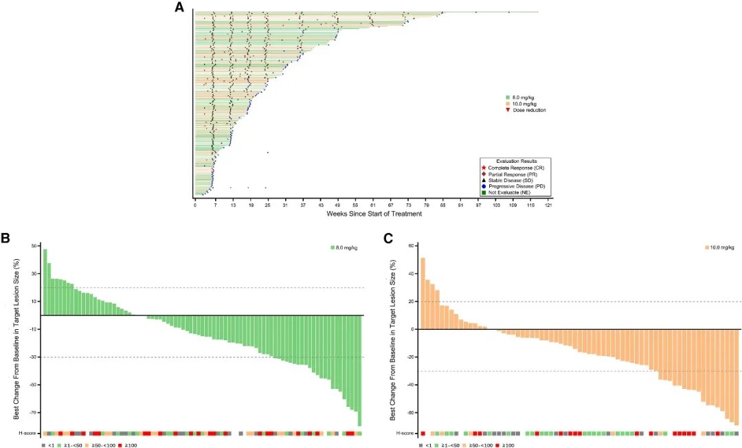 非小细胞肺癌(NSCLC):在152例患者中,总cORR为22.4%,DCR为80.9%,中位DoR为9.7个月。中位PFS和OS分别为5.5个月和13.7个月。研究还观察到,在无已知驱动基因突变的肺腺癌患者中,8.0 mg/kg剂量组的cORR达到33.3%。