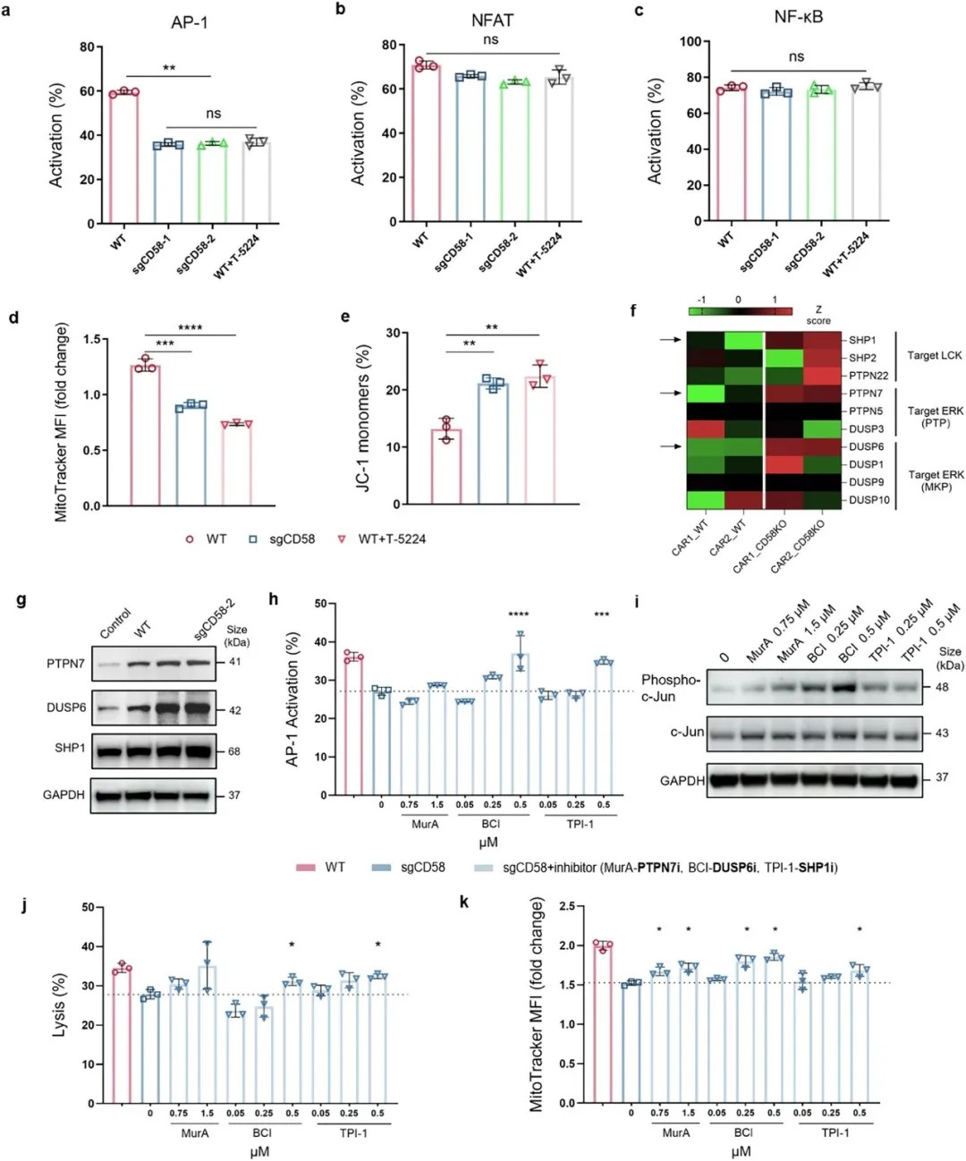 在机制明晰的基础上,研究团队开始寻找逆转这一颓势的策略。通过分析,他们发现位于AP-1信号通路上游的三个抑制性磷酸酶(SHP1, PTPN7, DUSP6)在CD58缺失的环境中表达上调。进一步的药理学和遗传学阻断实验表明,其中DUSP6的阻断效果最为显著和有效。