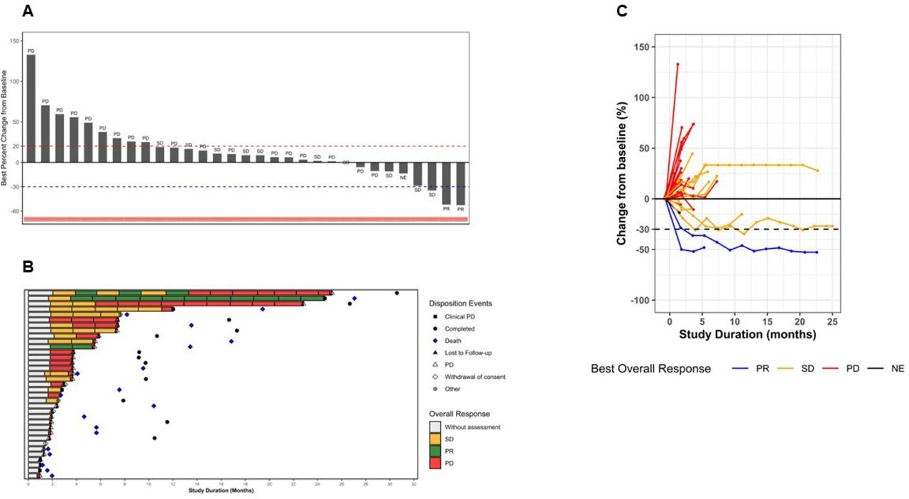 在 35 名接受治疗的患者中,31 名(88.6%)患者可依据 RECIST V.1.1 标准评估疗效。客观缓解率(ORR)为 5.7%(95%置信区间 1.6%至 18.6%),依据 RECIST V.1.1 和 iRECIST 标准评估结果一致,其中 2 名患者达到部分缓解(PR)。11 名患者(31.4%)病情稳定(SD),其中 5 名患者 SD 持续时间≥6 个月。4 名患者无法评估最佳缓解(BOR)。3 名患者未进行任何基线后评估。