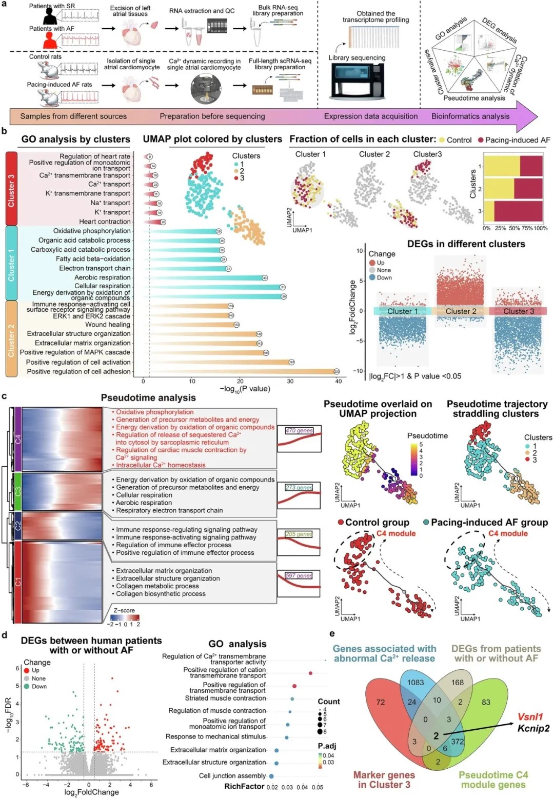 为寻找新的治疗靶点,研究团队采用了整合的多组学策略。他们结合了人类房颤患者和房颤模型动物的心房组织批量RNA测序、单心房心肌细胞转录组测序及电生理数据。通过复杂的生物信息学分析,研究人员从数千个候选基因中,将VILIP-1鉴定为与房颤及其病理性钙释放事件关联最强的全新候选基因。