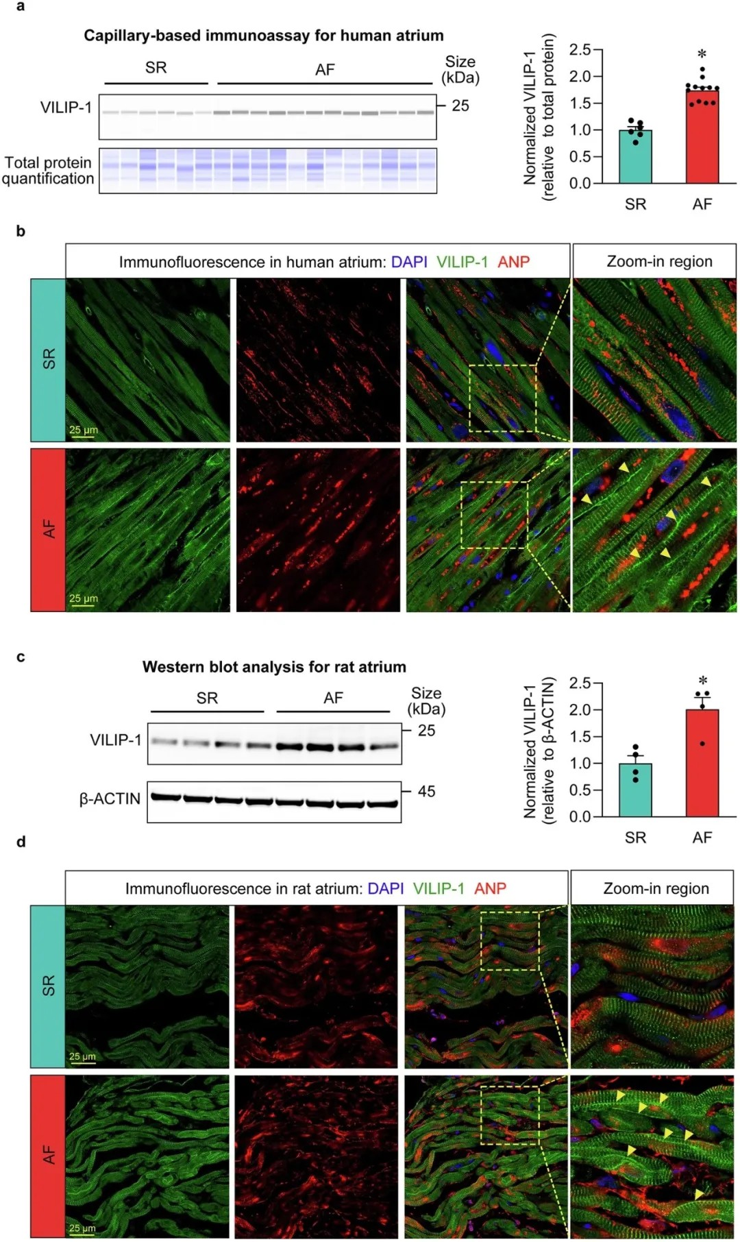 实验验证表明,在人类房颤患者和快速起搏诱导的大鼠房颤模型的心房组织中,VILIP-1的表达水平均显著上调,并且其在心肌细胞膜上的定位增强。