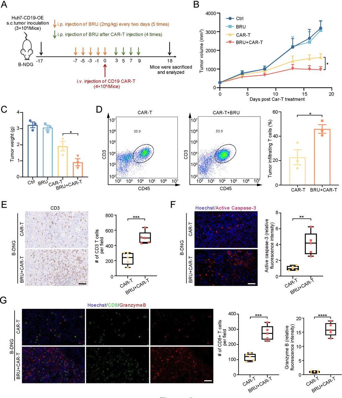 鉴于上文提到的 Nrf2 抑制在避免免疫逃逸方面的功能,研究人员试图研究 BRU 是否能增强另一种基于 T 细胞的免疫疗法——CAR-T 细胞在体内杀伤肝癌细胞的能力。研究人员建立了 B-NDG 小鼠模型,使用靶向 CD19 过表达的 Huh7 细胞(Huh7-CD19-OE)的人 CD19 CAR-T 细胞,以评估 BRU 在体内如何调节 CAR-T 细胞介导的细胞毒性。BRU 治疗联合 CAR-T 细胞显著抑制了肿瘤生长,表明 BRU 增强了 CAR-T 细胞介导的肝癌细胞杀伤作用。研究人员从肿瘤组织中分离并分析了肿瘤浸润淋巴细胞(TILs),结果显示联合治疗组中 CD3+ T 细胞的数量显著增加。同样,免疫组织化学分析也显示联合治疗组中 CD3+ T 细胞的数量更高。此外,不同组别的 B-NDG 小鼠体重无差异。对包括肝脏、脾脏、肺和肾脏在内的内脏器官进行组织病理学分析表明,CAR-T 与 BRU 的联合治疗对小鼠无不良副作用。与上述机制研究结果一致,BRU 与 CAR-T 疗法的联合使用显著增加了肿瘤组织中 CD8+CTL 细胞群、活性 CCA3 水平和 GzmB 分泌。综上所述,Nrf2 抑制增强了 CAR-T 细胞在体内杀伤肝癌细胞的能力。