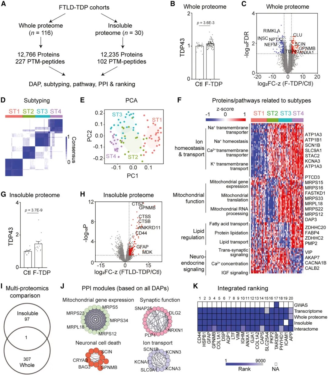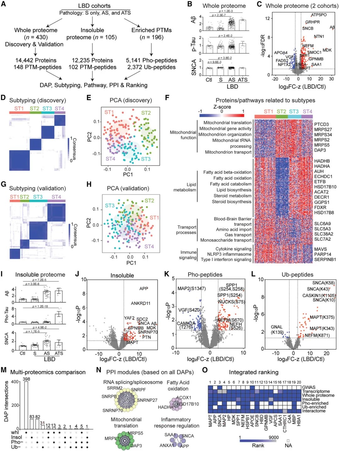 研究团队采用了一种先进的多层蛋白质组学策略,对2279例死后人脑样本(包括阿尔茨海默病、路易体痴呆、伴有TDP-43病理的额颞叶变性、伴有tau病理的进行性核上性麻痹、血管性痴呆及帕金森病)进行了系统分析。分析涵盖了全蛋白质组、不溶性蛋白质组(富集错误折叠和聚集蛋白)以及翻译后修饰。