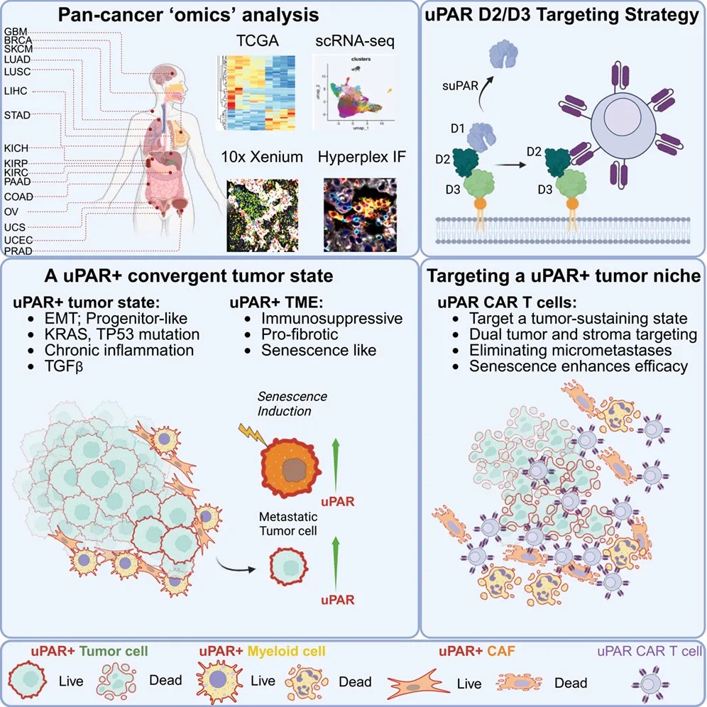 该研究确立了uPAR作为一个具有广阔应用前景的CAR-T靶点,它能够克服实体瘤治疗中的主要障碍,研究的目标不仅是杀死肿瘤细胞,更是要瓦解维持肿瘤生长的整个病理生态系统。这为实现下一代超越肿瘤类型的CAR-T疗法提供了框架。